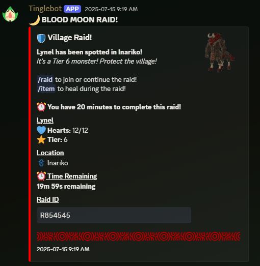 To join a raid, open the thread you have been tagged in either as a Village Resident, or Village Visitor. The top of the thread will display the Monster that has emerged, the Tier of Raid (Tier 5 - Tier 10), how many Hearts the monster has, the Time Limit for completing the raid, and a Raid ID. All Raid ID's start with R and are followed by a unique 6 digit code.